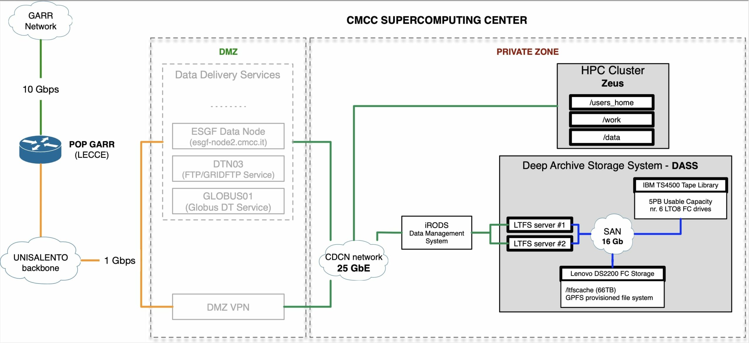 Il Centro di Supercalcolo (SCC) del CMCC a Lecce, attivo dal 2008, è la più grande struttura di calcolo in Italia – e tra le più avanzate in Europa – dedicata esclusivamente alla ricerca sui cambiamenti climatici e alle loro interazioni con la società e i sistemi economici. Il Centro di Supercalcolo del CMCC è stato potenziato nel 2022 sia per quello che riguarda la struttura di calcolo che i sistemi di archiviazione.