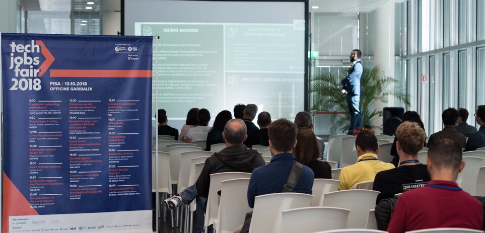 La prima edizione del TECH JOBS fair di Pisa si è svolta sabato 13 ottobre 2018 al piano terra delle Officine Garibaldi grazie al supporto di Talent Garden Pisa, Internet Festival, Bianco Lavoro – Euspert, Forti Sviluppo Immobiliare, Google Developers Group Pisa.